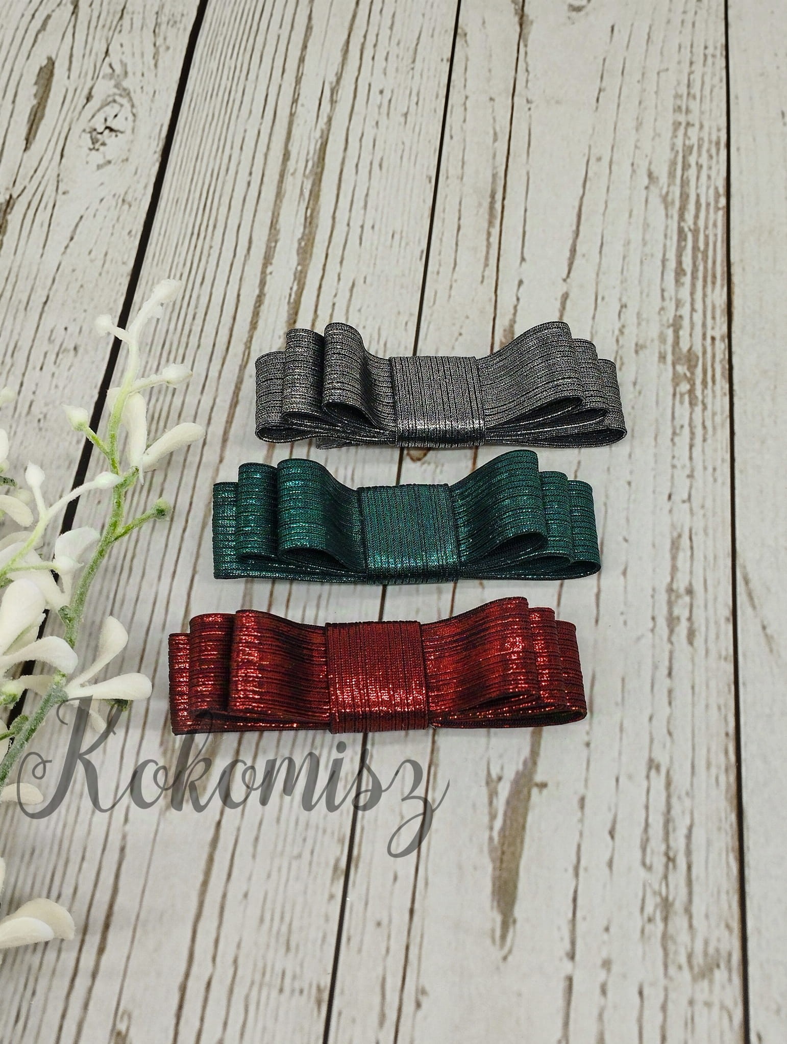 Zestaw spinek z potrójną kokardką wykonany z pięknie mieniącej się materiałowej wstążki.